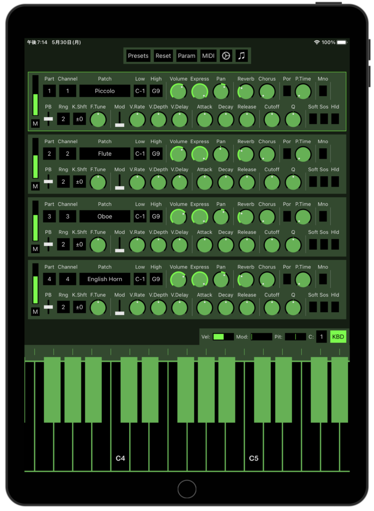 読み込めるサウンドセット形式: Sound Font(sf2), Compressed Sound Font(sf3), Downloadable Sound(DLS)
